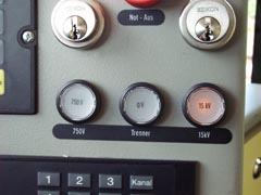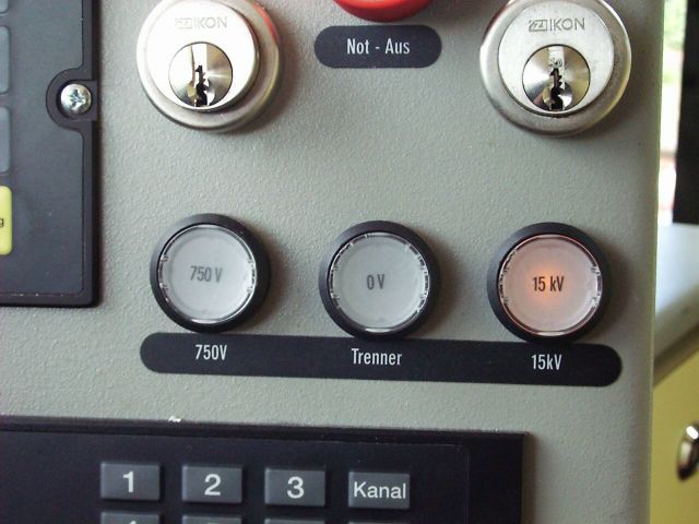 KVVのSバーン運転席(走行中) ランプ左からDC750V(トラムのシステム)・0V・AC15kV(鉄道のシステム)。