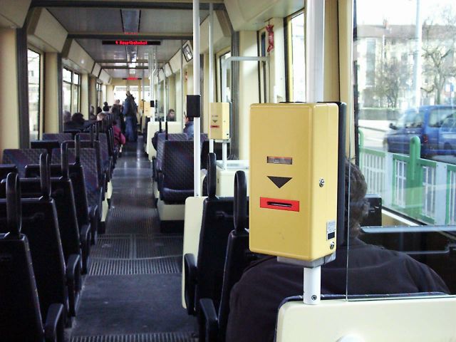 初めてドイツのSバーン・トラム・バスを利用して驚いたのが乗車券の検札システム。停留所の自動販売機で買った乗車券を、車内の検札ボックスに挿入すると“チーン!”という音と共に列車番号と日時が刻印される。乗車するとき運転手に切符を見せる必要もないし、降りるとき切符を出す必要も無い。トラムには数箇所の出入り口があり、乗客はどこを使ってもいいので、乗降がスムーズでトラムの停車時間が短くて済む