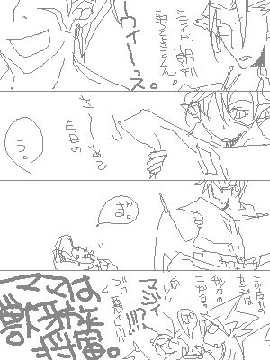 コレを描くつもりで、ああなったと思われます。 何故なら、昼間考えていたのはこっちだったから。 ママは獣牙族将軍(元スパイ)。 ゴロ悪い上に長い。 むしろ、これ、何人判りますか。 眠気が勝ると、シルヴィがタイムスリップして過去の両親のもとに来る話が、セツナがカシス味のシェイドを食う話になるようです。 続きません。